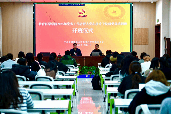 为扎实做好发展党员全过程培养教育工作,提升学生党务工作者与入党积极分子的政治理论水平、党性修养及党务工作能力,保障新发展党员质量,按照学校党校相关工作部署,新疆师范大学教育科学学院于 2025 年 10 月 27 日至 30 日成功举办 2025 年党务工作者暨入党积极分子院级党课培训班。