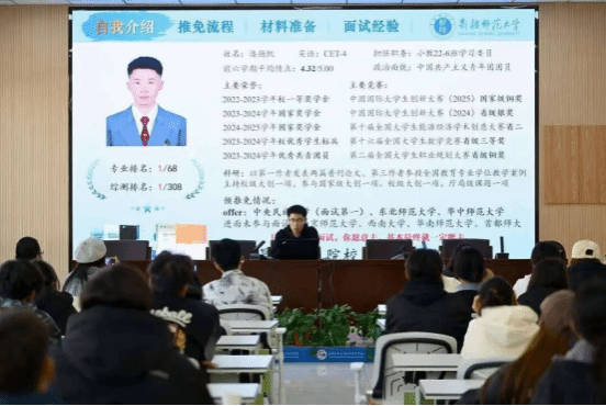在领略课堂魅力之后,我们关注未来发展,优秀学长代表潘扬凯从学习实践,以及保研经验进行了分享。