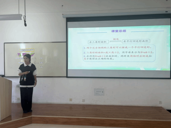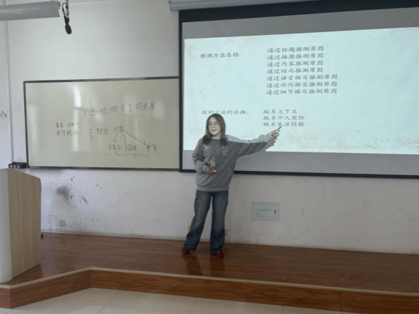 汇报最后,两位同学以模拟课堂的形式展开汇报,呈现了生动的教学实践案例。小学教育22-4班唐努热选取三年级上册课文《总也倒不了的老屋》,创新采用“剧本杀”形式设计课堂,打破传统教学模式,凭借新颖有趣的呈现方式,吸引了在场师生的注意力,展现了对课堂互动设计的巧思。小学教育22-5班努尔比亚围绕五年级上册“三角形的面积”知识点进行教学展示,讲解过程逻辑清晰且生动形象,将抽象的数学知识具象化,获得了在场师生的认可。