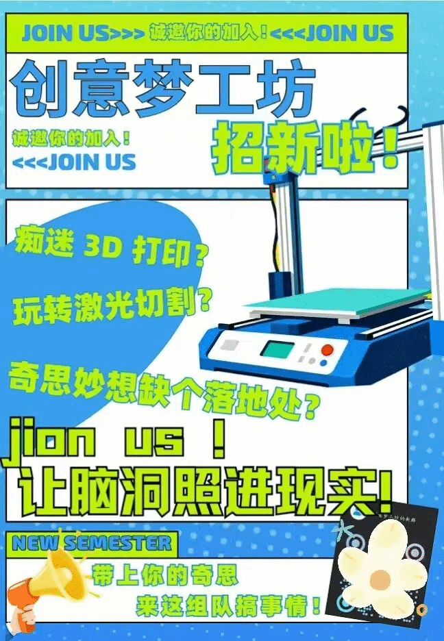 欢迎来到创意梦工坊!这里是创意与科技碰撞的奇妙工坊。我们致力于为所有对3D造物感兴趣的同学们提供一个从虚拟到现实的创造平台。无论你是零基础的小白,还是已有经验的爱好者,在这里都能找到属于自己的舞台。社团活动涵盖3D建模软件学习(如Blender、Fusion360)、模型切片处理、3D打印机操作维护以及后期打磨上色等全流程。我们相信,每一个绝妙的点子都值得被实现。从个性化的桌面摆件、实用的生活工具,到复杂的机械结构原型,你的想象力就是唯一的边界。加入我们,亲手将脑海中的蓝图变为触手可及的实物,共同探索增材制造的无限可能!