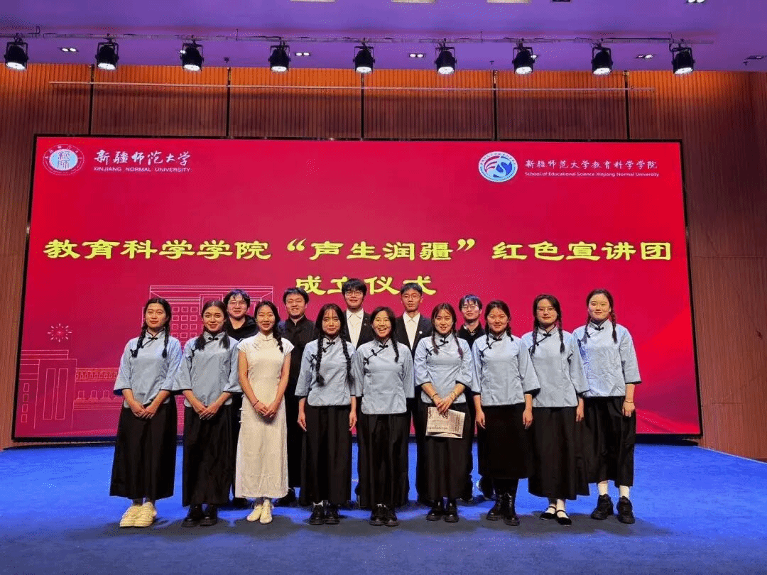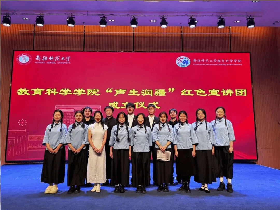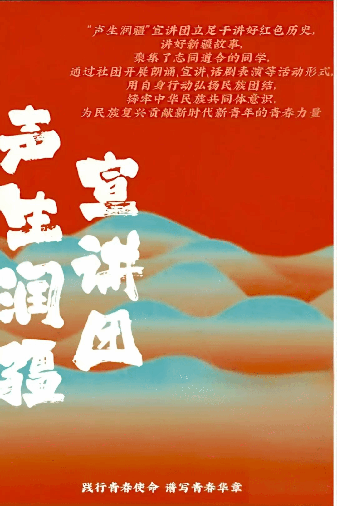 “声生润疆”宣讲团隶属于教育科学学院,作为校园文化建设的先锋力量,自创立以来始终致力于传承红色基因、弘扬时代强音。宣讲团以朗诵为媒介,融革命精神的深沉、时代声音的铿锵与语言艺术的感染力于一体,在诵读中传递信仰之光、凝聚奋进之力。通过系统培训与多元实践,团队构建了从基础训练到舞台展演的全流程成长体系,精准赋能成员表达力与思想力,成为校园红色文化传播的重要阵地,更是连接革命精神与师范生思政教育的桥梁。