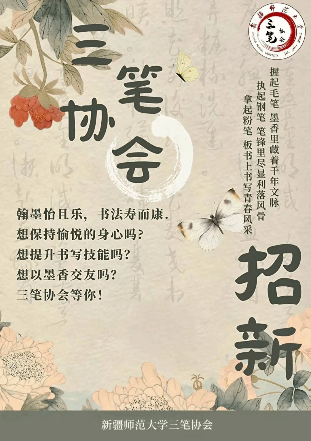 新疆师范大学三笔协会隶属教育科学学院,作为“十佳社团”之一,三笔协会自成立以来深耕汉字书写传承,融硬笔挺拔、软笔遒劲、粉笔灵动于教学实践,于笔墨间雕琢书写之美、涵养文化自信。设多类特色课程,精准匹配成员需求,搭建从基础到展演的全链条成长平台,是校园书写文化引领者,更是连接传统笔墨与师范生素养培育的坚实纽带。以笔为媒,让汉字之美浸润校园,让文化之根深植心间。